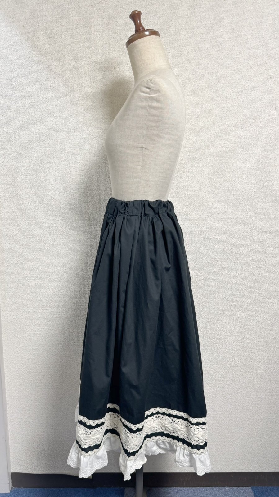 ハンドメイドギャザースカート4【黒無地×生成トーション裾綿レース・70cm丈】