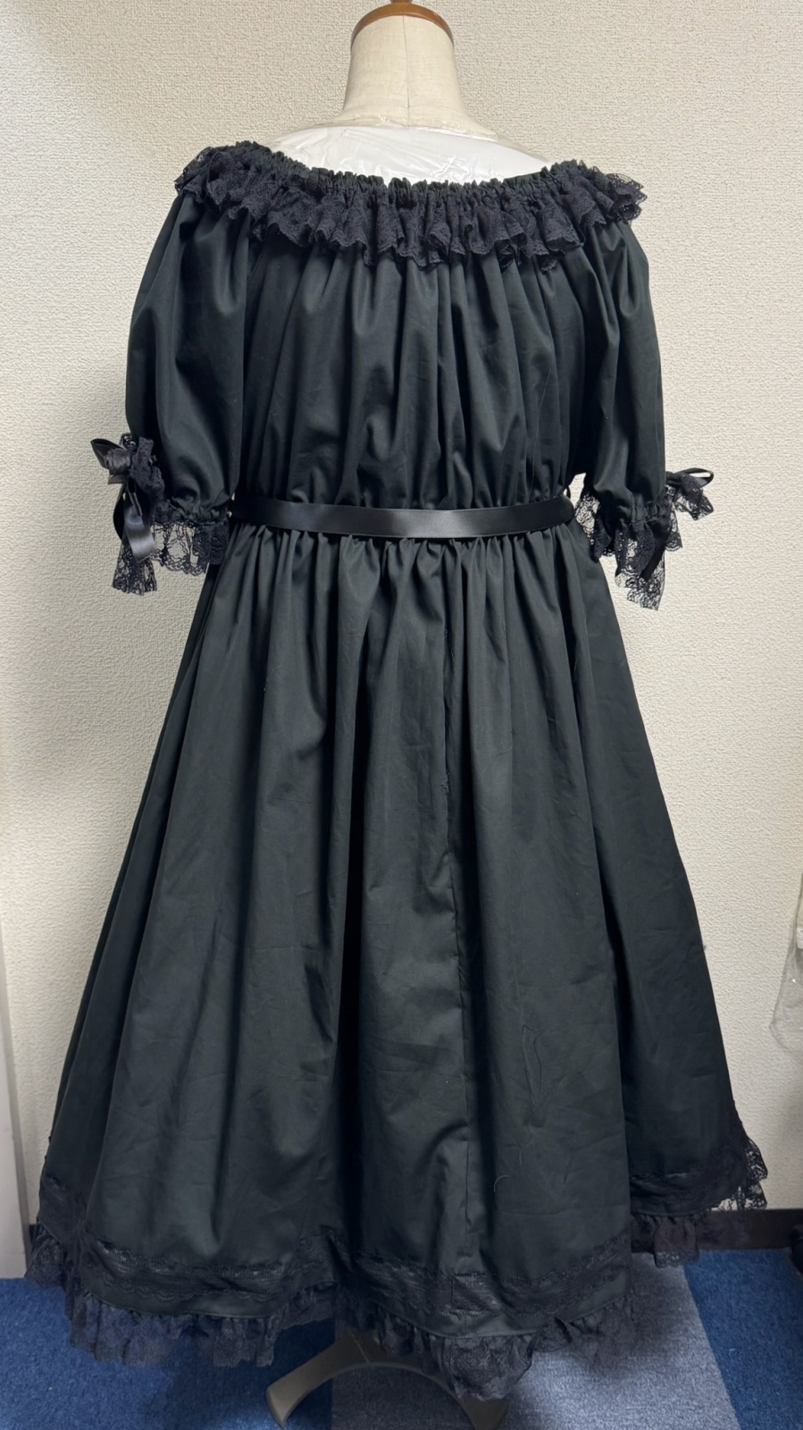【プラスサイズ】ブローチピン付きデイリーシャーリングワンピース【黒無地×ラッセルレース118cm】 [戻る]