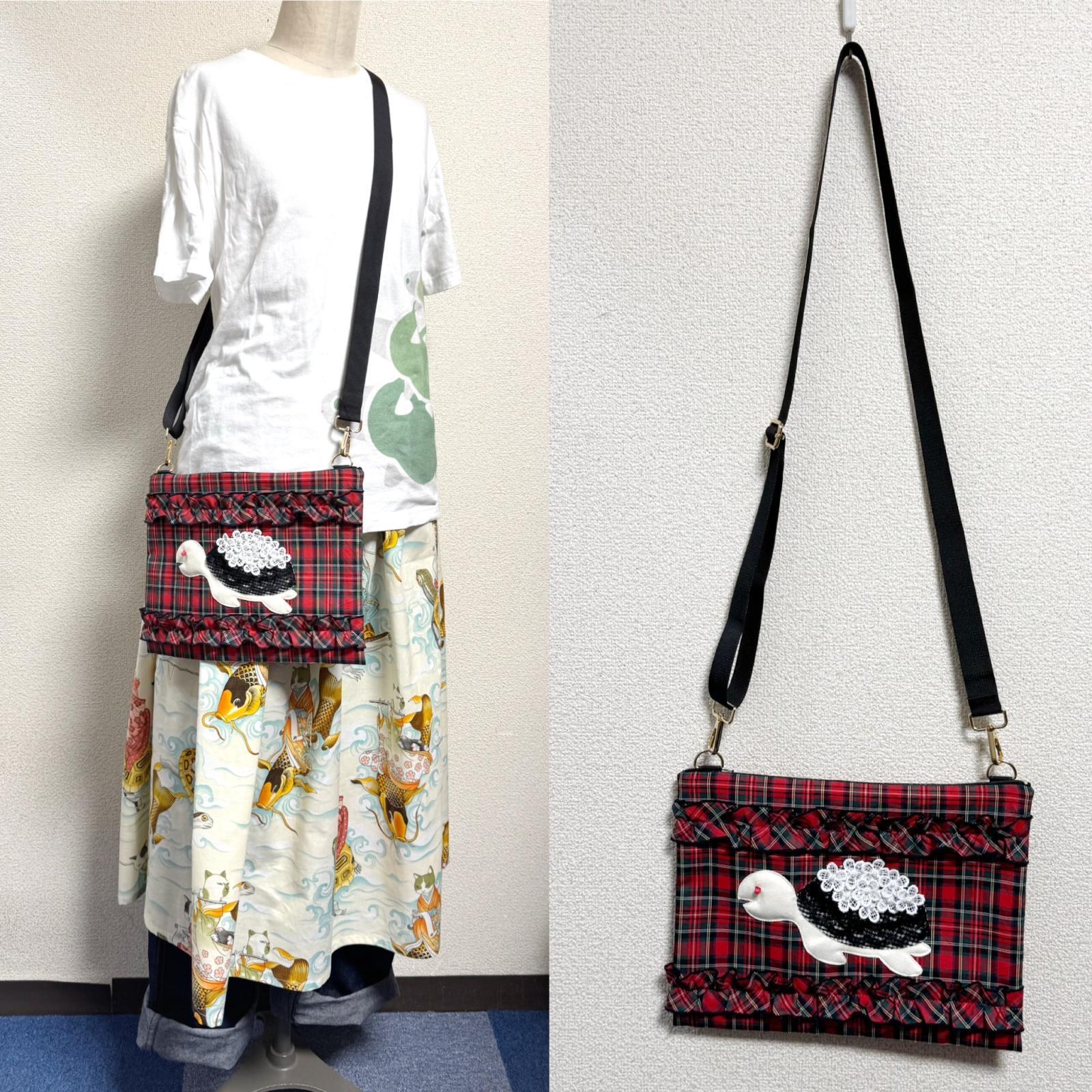 お出かけカメちゃん サコッシュ (赤チェック×白カメちゃん)