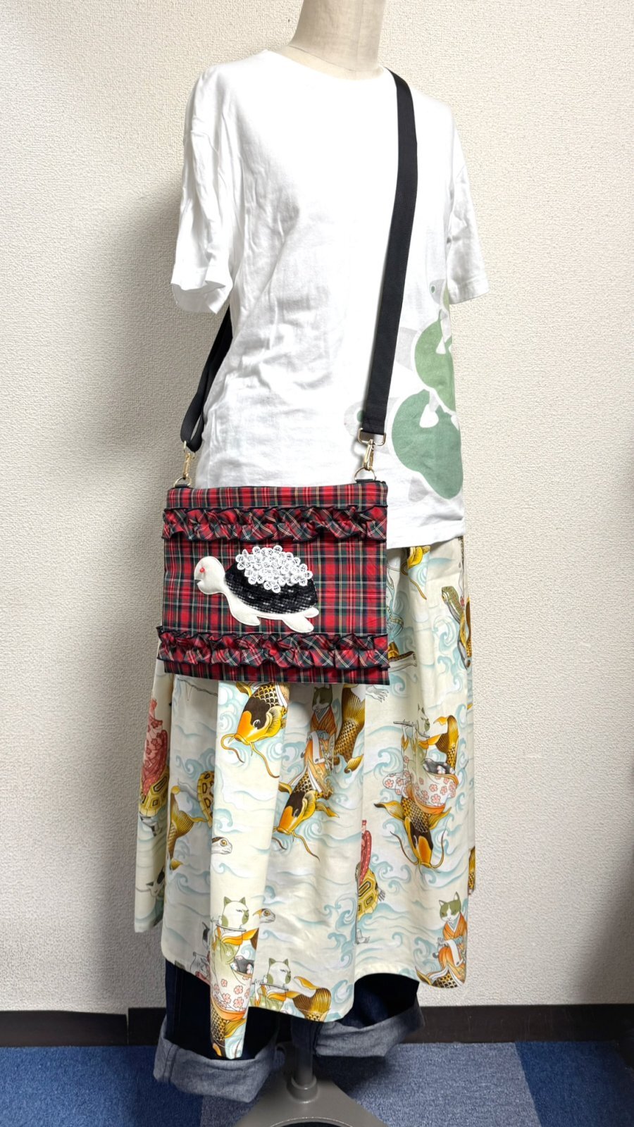 お出かけカメちゃん サコッシュ (赤チェック×白カメちゃん)