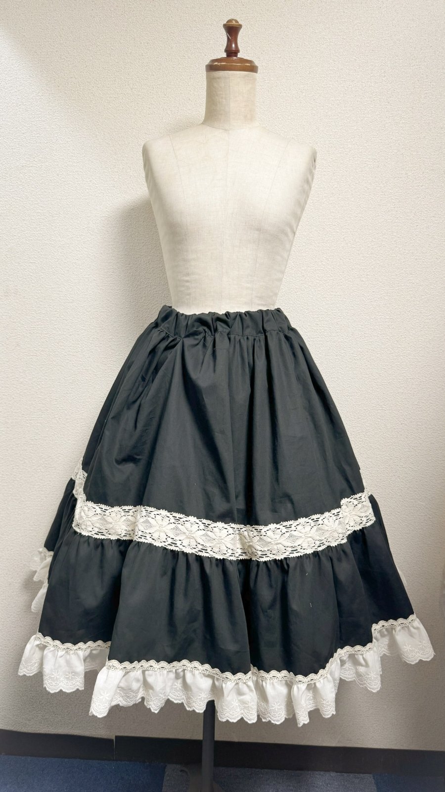 ハンドメイド2段ティアードスカート3【黒無地×生成トーションレース裾綿レース・60cm丈】