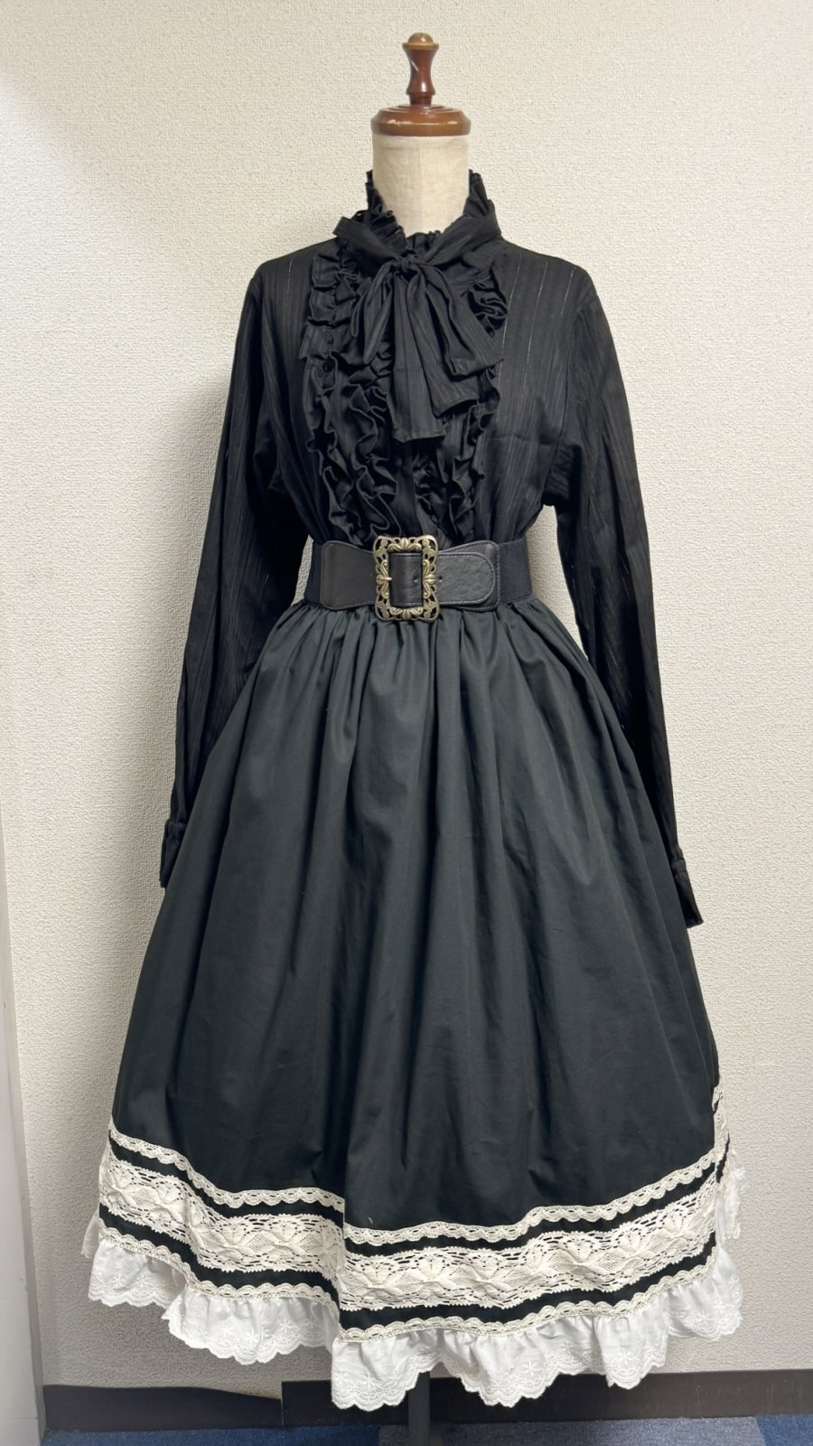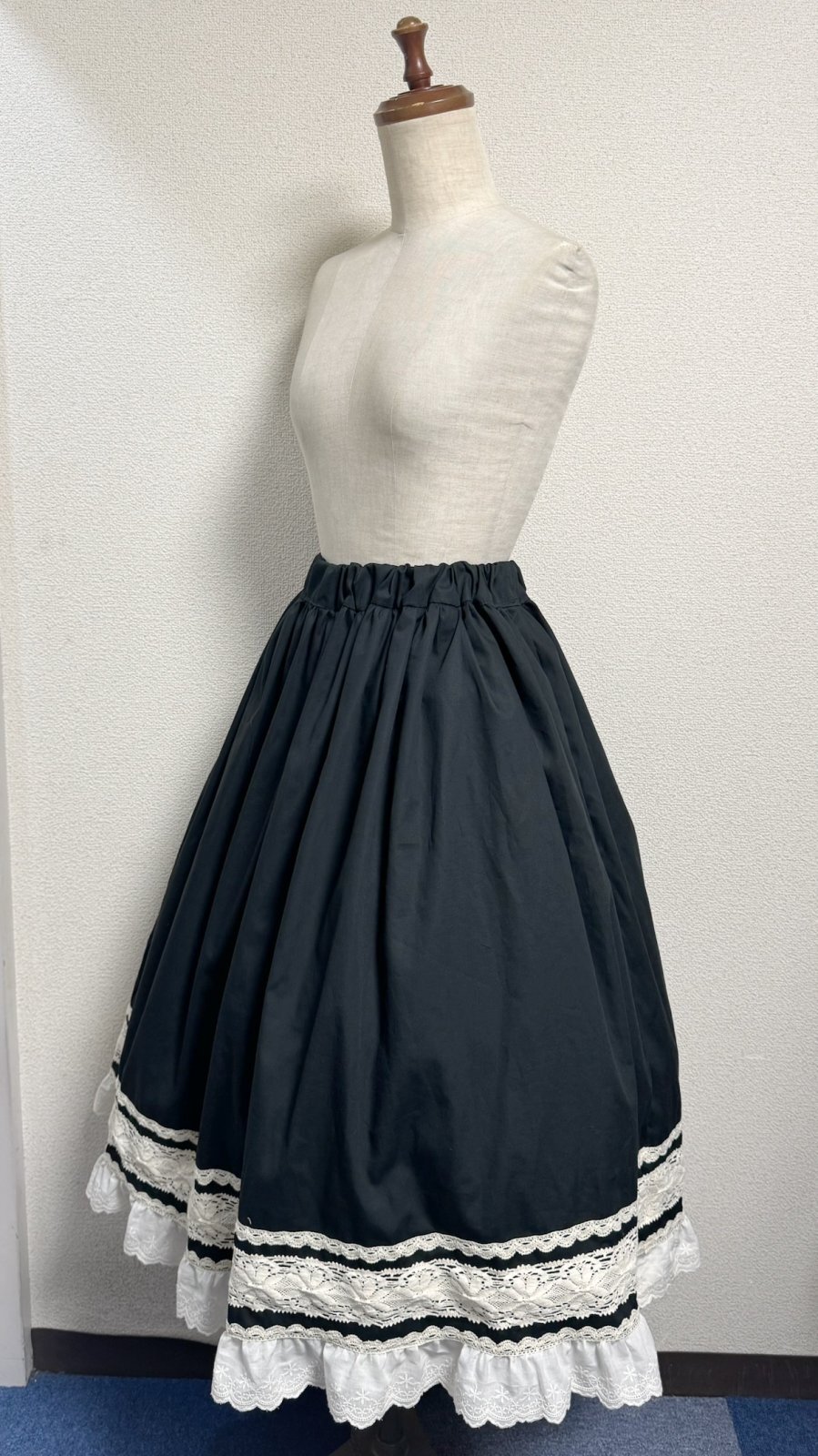 ハンドメイドギャザースカート4【黒無地×生成トーション裾綿レース・70cm丈】
