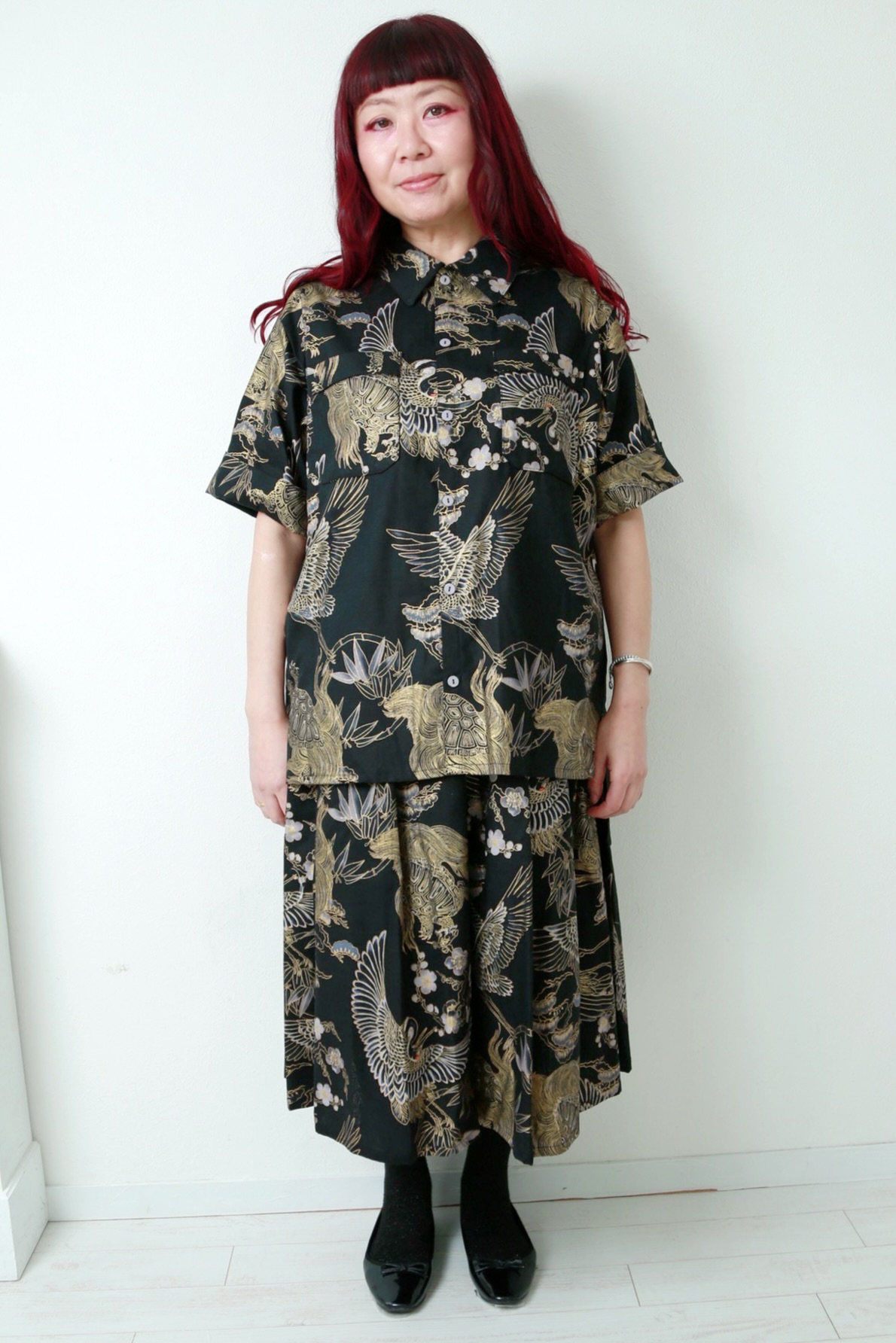 7ハンドメイドギャザースカート【鶴亀柄 黒系 78cm丈】