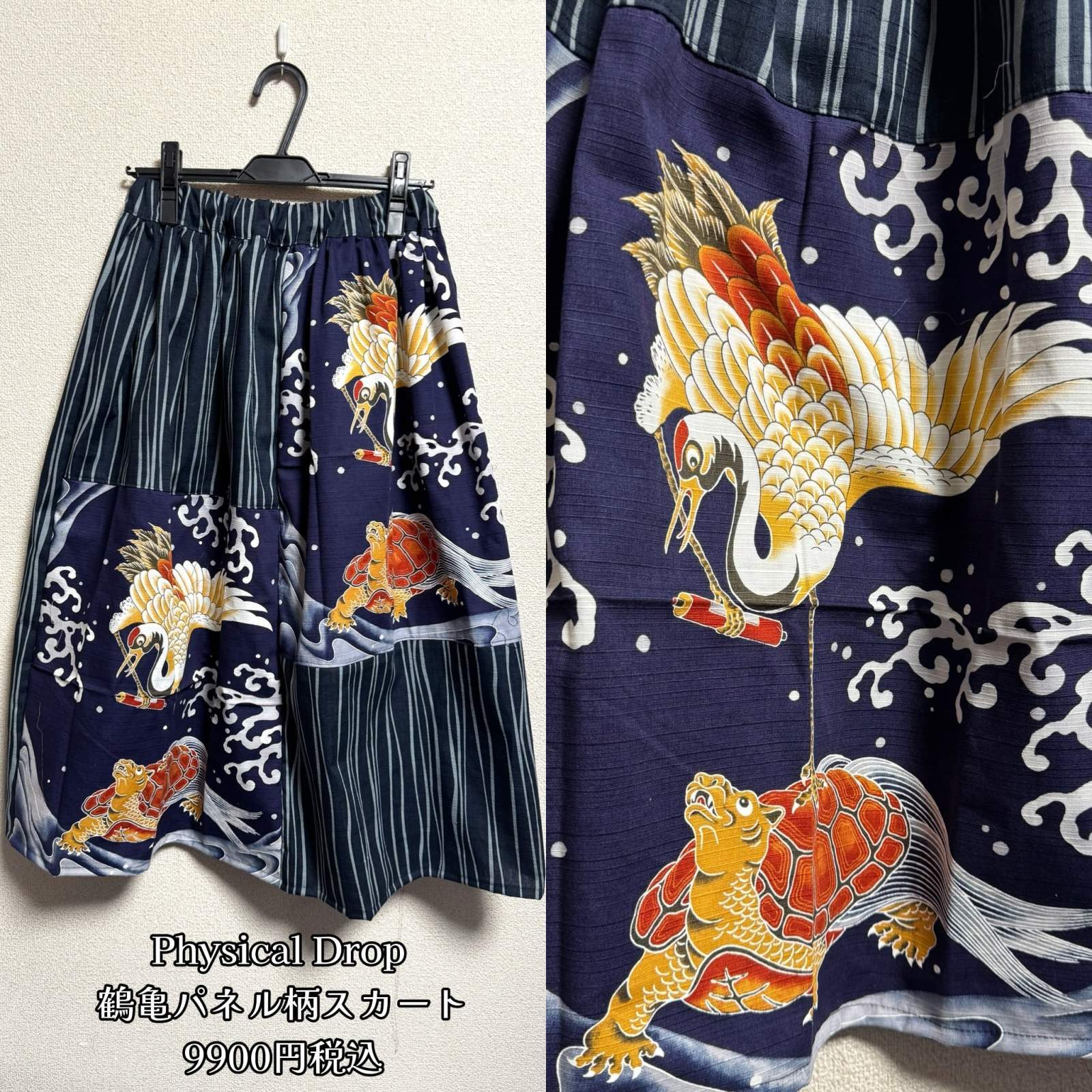 7ハンドメイドギャザースカート【パネル鶴亀柄 ネイビー系 78cm丈】
